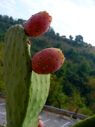 Opuntia ficus-indica (Indian Fig Opuntia) is a species of cactus and a long-domesticated crop plant important in agricultural economies throughout arid and semiarid parts of the world. Indian Fig Opuntia is grown primarily as a fruit crop, but also for the vegetable nopales and other uses. Most culinary references to the "prickly pear" are referring to this species. The name "tuna" is also used for the fruit of this cactus, and for Opuntia in general (according to Alexander von Humboldt, it was a word of Haitian origin taken into the Spanish language around 1500). Cacti are good crops for dry areas because they efficiently convert water into biomass. Opuntia ficus-indica, as the most widespread of the long-domesticated cactuses, is as economically important as corn and tequila agave in Mexico today. Because Opuntia species hybridize easily (much like oaks), the wild origin of Opuntia ficus-indica is likely to have been Mexico due to the fact that its close genetic relatives are found in central Mexico.[1]