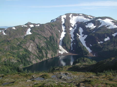 Frosted mountain reflects into yet another lake.