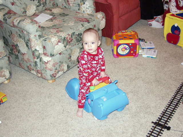 Jacob sits on Hippo toy vacuum.