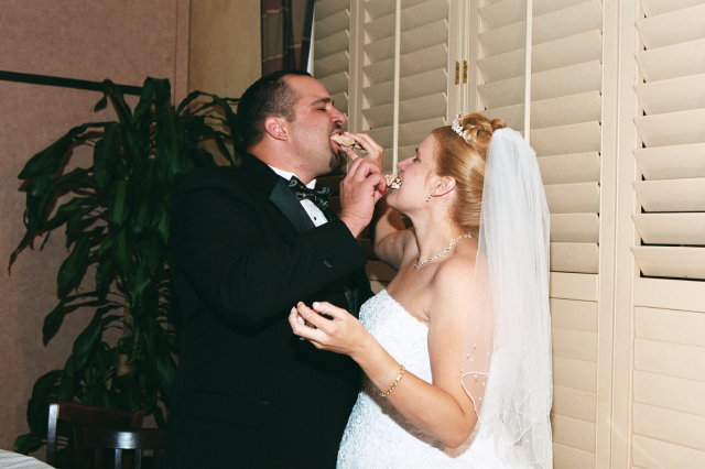 They gently feed each other cake